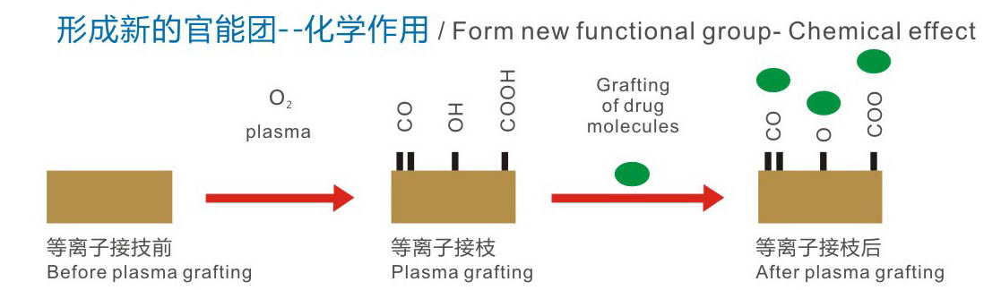 如果放電氣體中引入反應性氣體,那么在活化的材料表面會發生復雜的化學反應,引入新的官能團,如烴基、氨基、羧基等,這些官能團都是活性基團,能明顯提高材料表面活性。